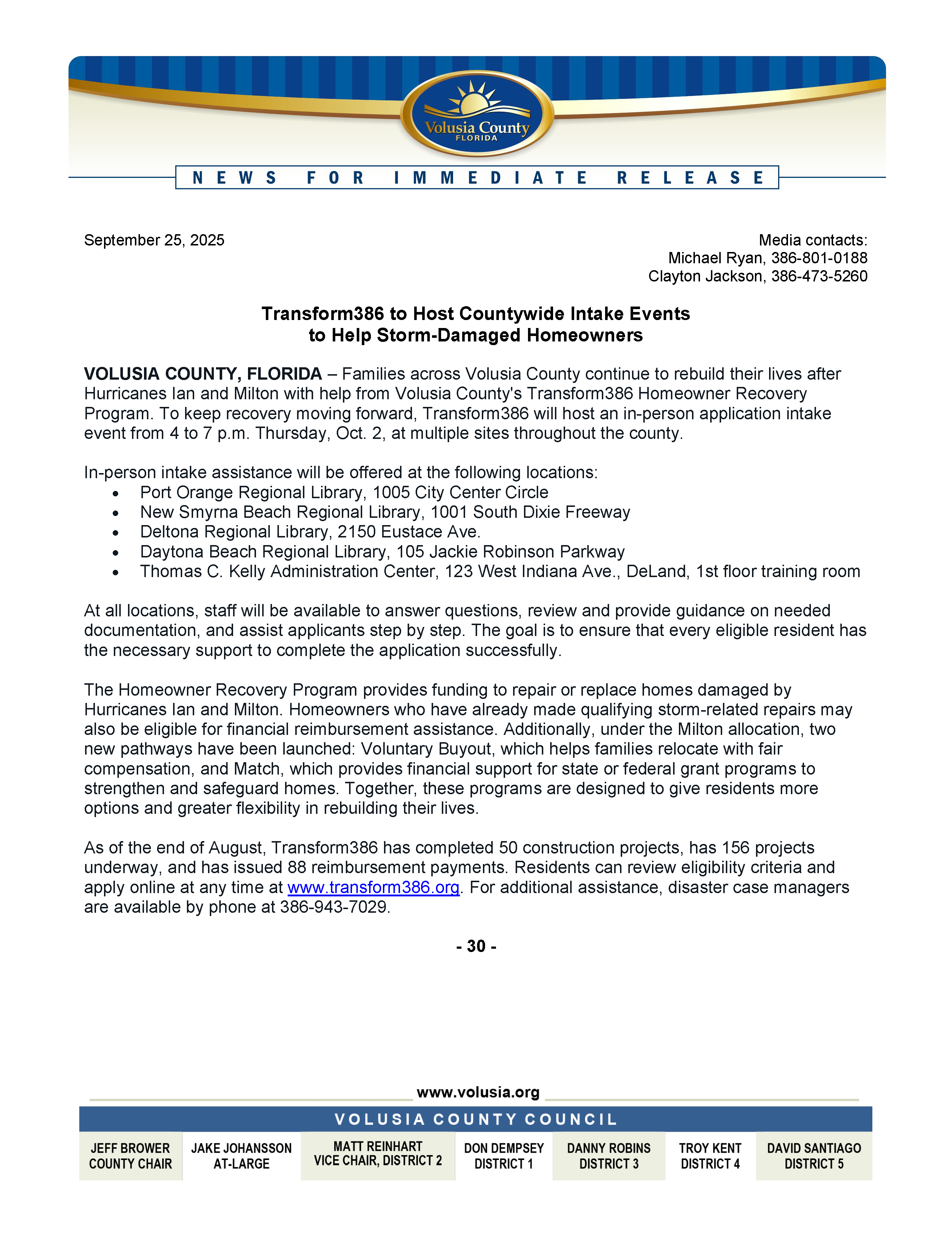 As of the end of August, Transform386 has completed 50 construction projects, has 156 projects underway, and has issued 88 reimbursement payments. Residents can review eligibility criteria and apply online at any time at www.transform386.org. For additional assistance, disaster case managers are available by phone at 386-943-7029.